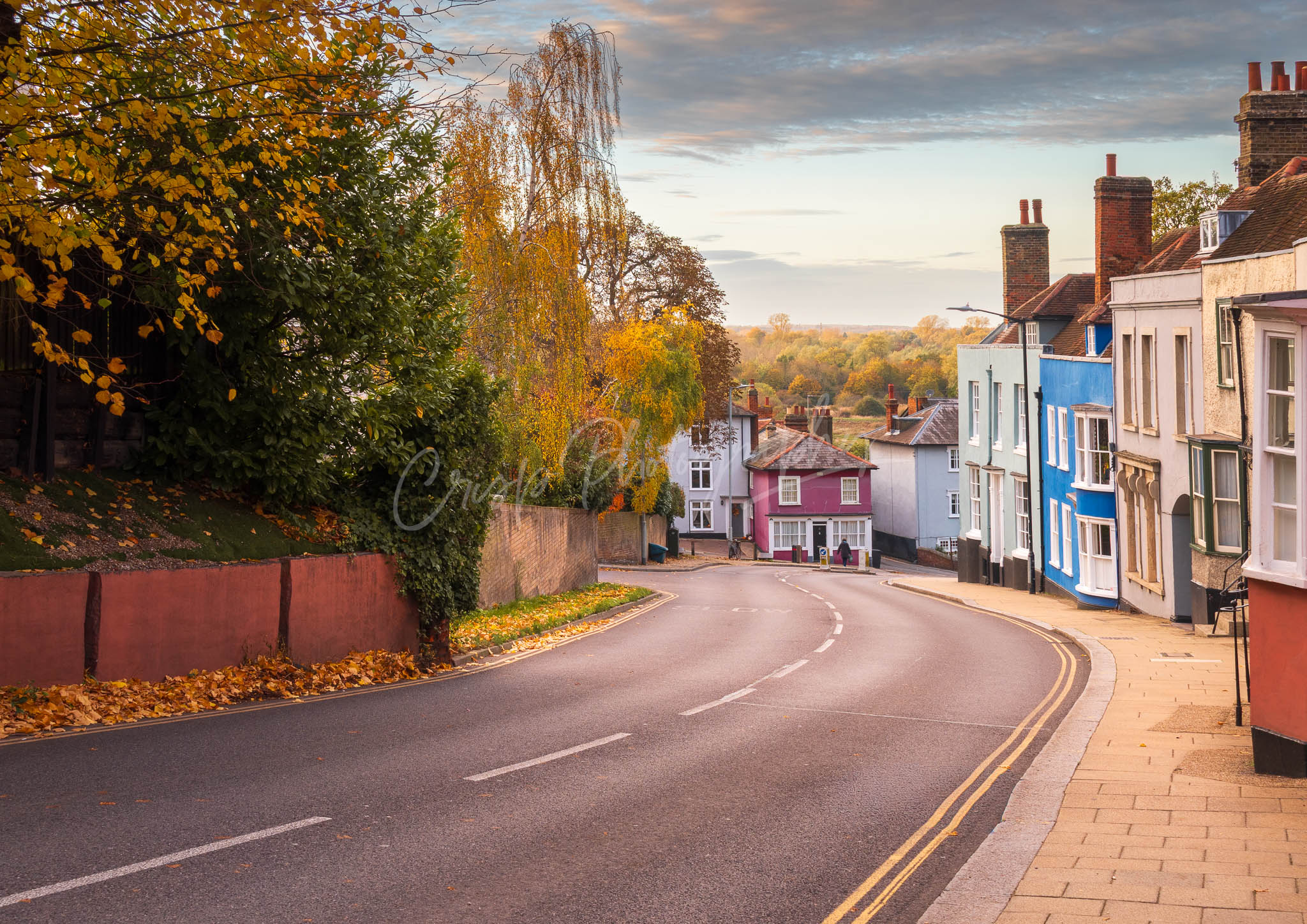 Autumn colour on Market Hill, Maldon. A quiet moment on the main hill to Maldon, this classic scene is lifted with autumn colour across the Chelmer valley. High quality professional prints on 260gsm gloss photo paper.