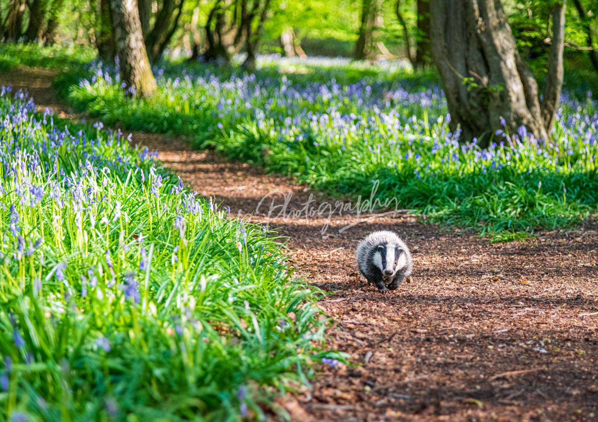 Billie The Badger Running Through the Bluebells. Badger cub in the woods. Available in colour. High quality professional prints on 260gsm gloss photo paper.