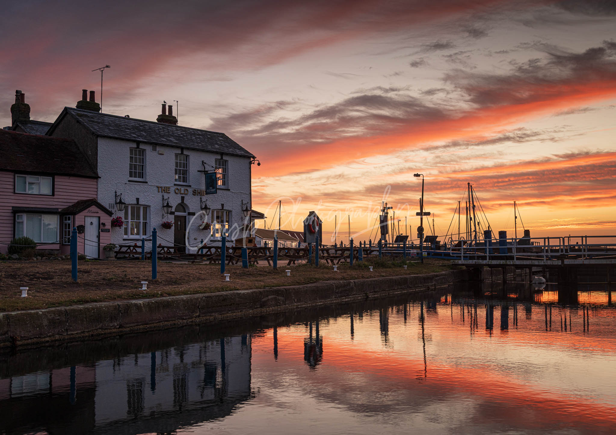 The Old Ship pub, a new day at Heybridge Basin. A wonderful sunrise sky reflecting in the water of the Heybridge Basin Lock. High quality professional prints on 260gsm gloss photo paper.